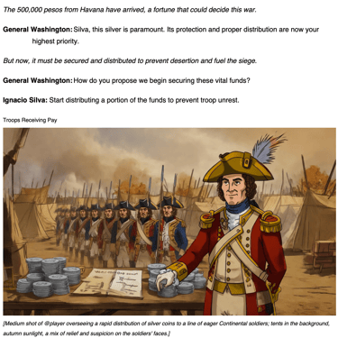 You must strategically manage the flow of 500,000 silver pesos from Havana to fund the crucial Franco-American siege of Yorktown in 1781, ensuring troops are paid and supplied to secure victory. Your success depends on balancing financial distributions and troop deployments to maintain morale and trust among allied commanders while the siege intensifies around you.